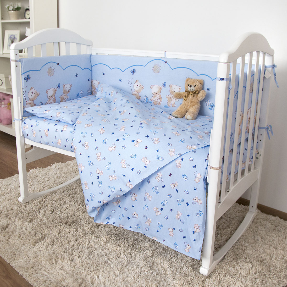 Размер: Пододеяльник 112х147 см., простынь 112х147 см., наволочка 40х60 см., подушка 40х60 см., одеяло стеганое 110х140 см., борт 120х35 см., 60х35 см.,