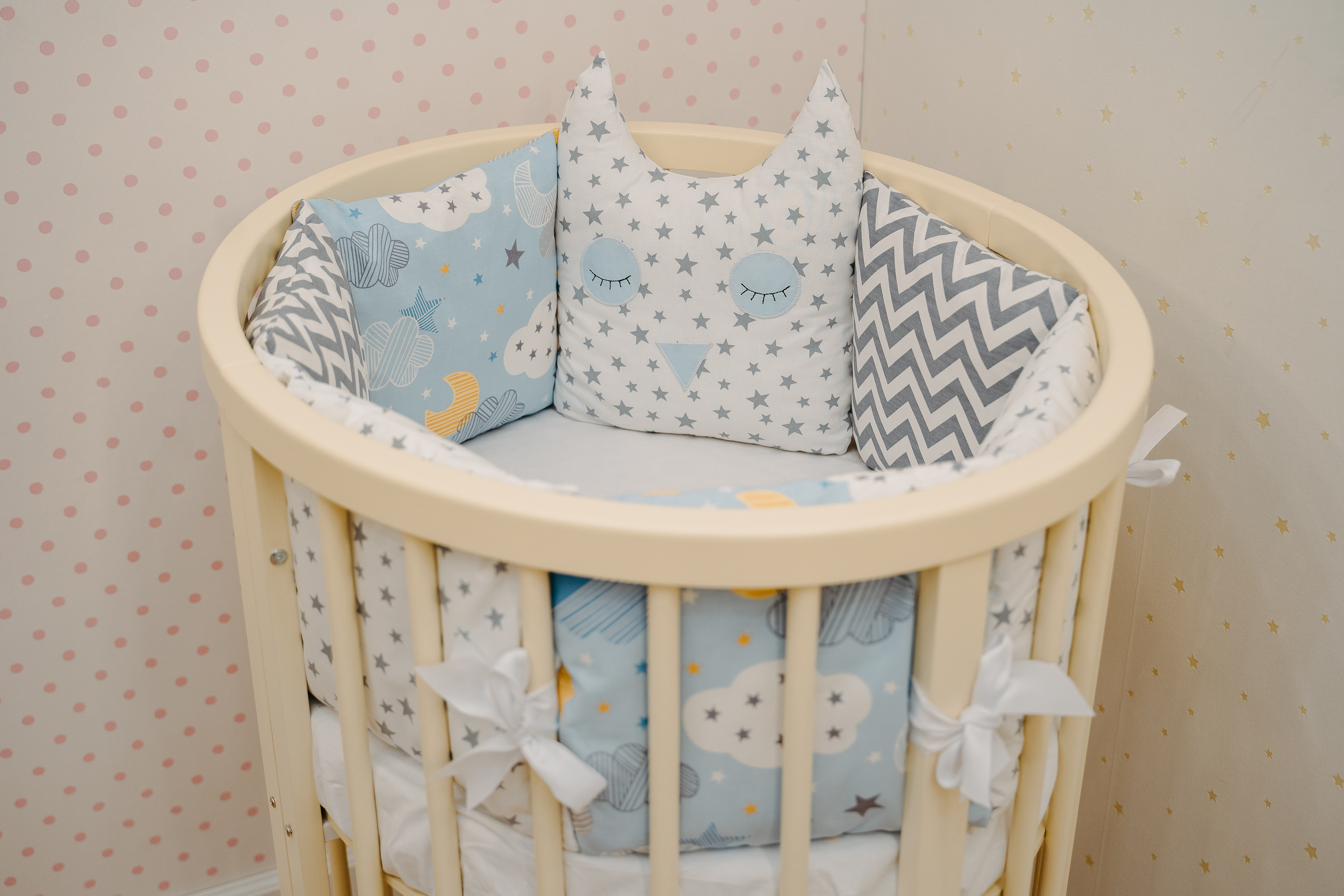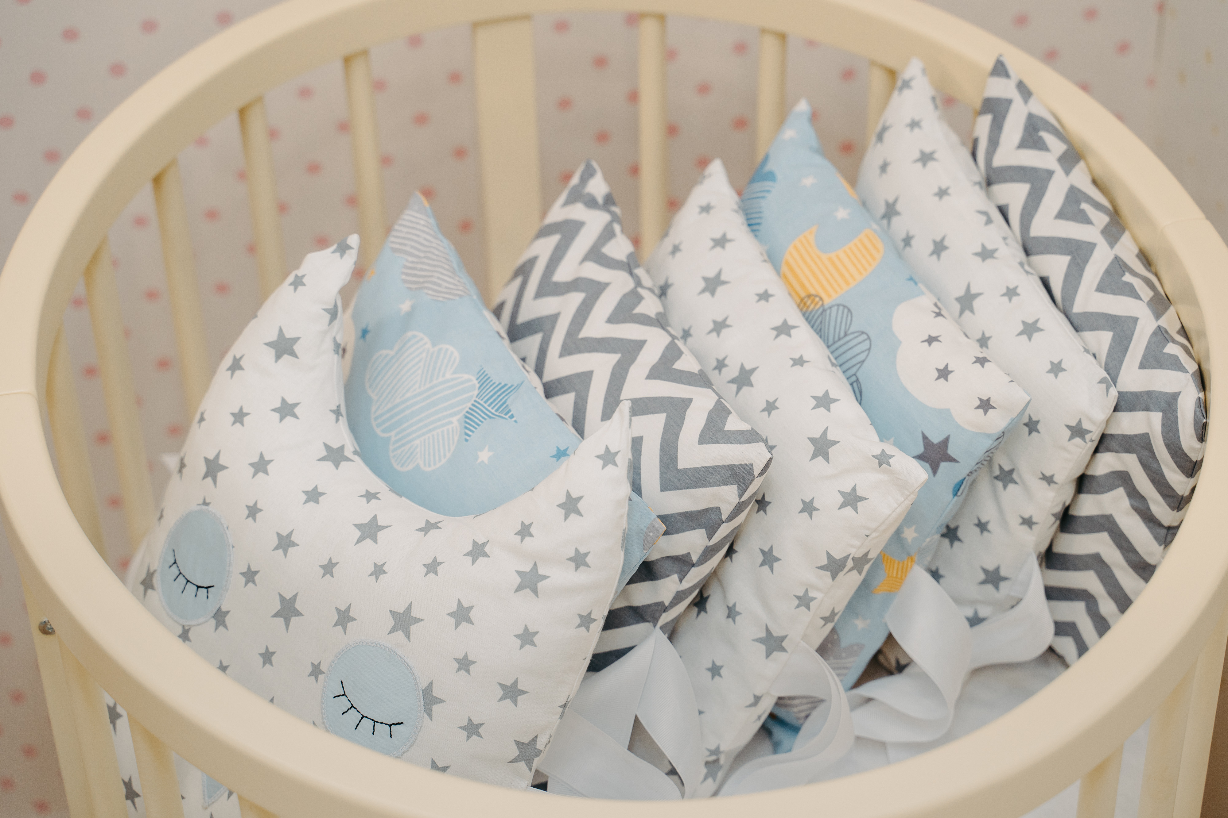 • 12 бортов-подушек со съёмными чехлами на молнии, размерами 32*30см. - универсальный борт на форму любой кроватки.