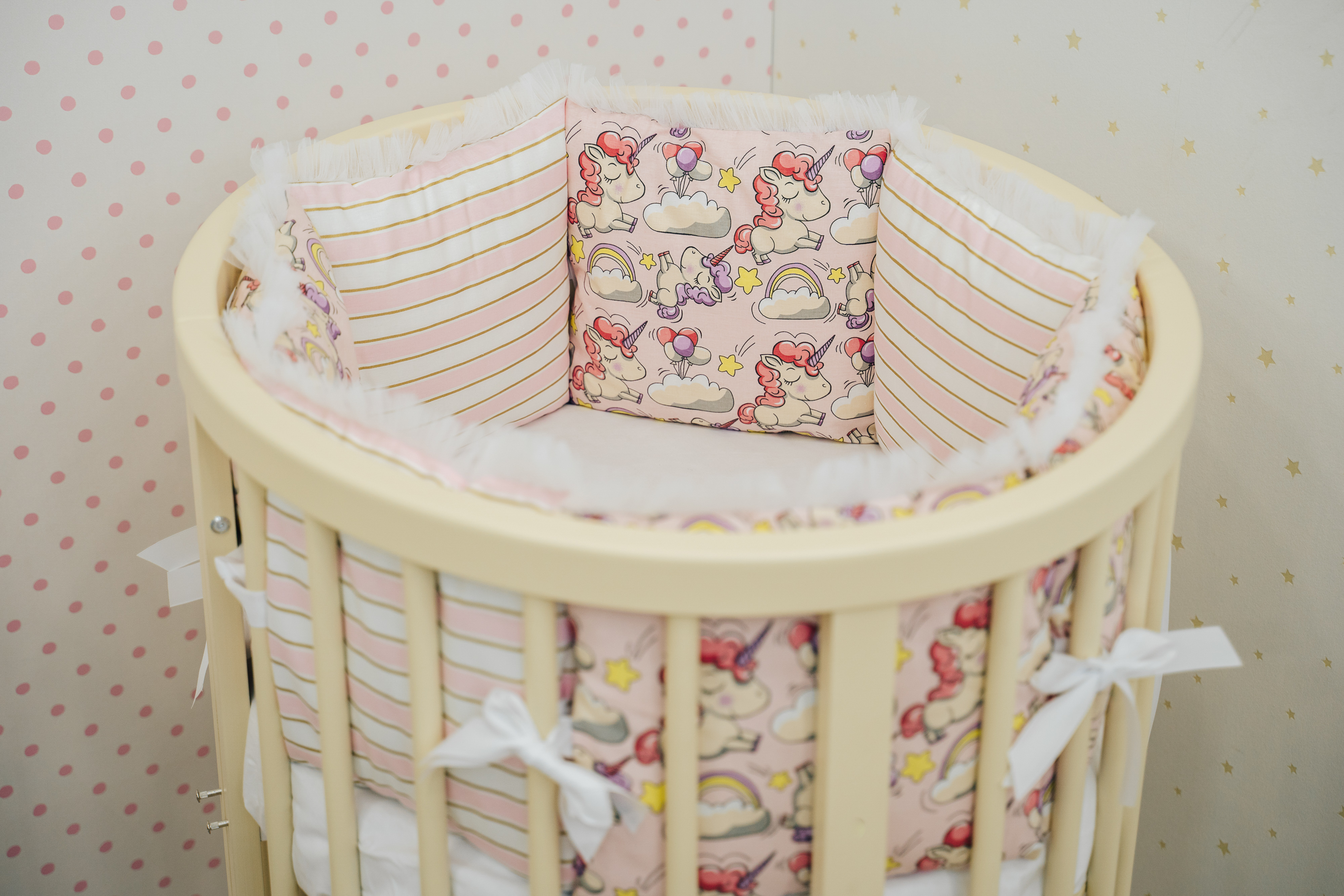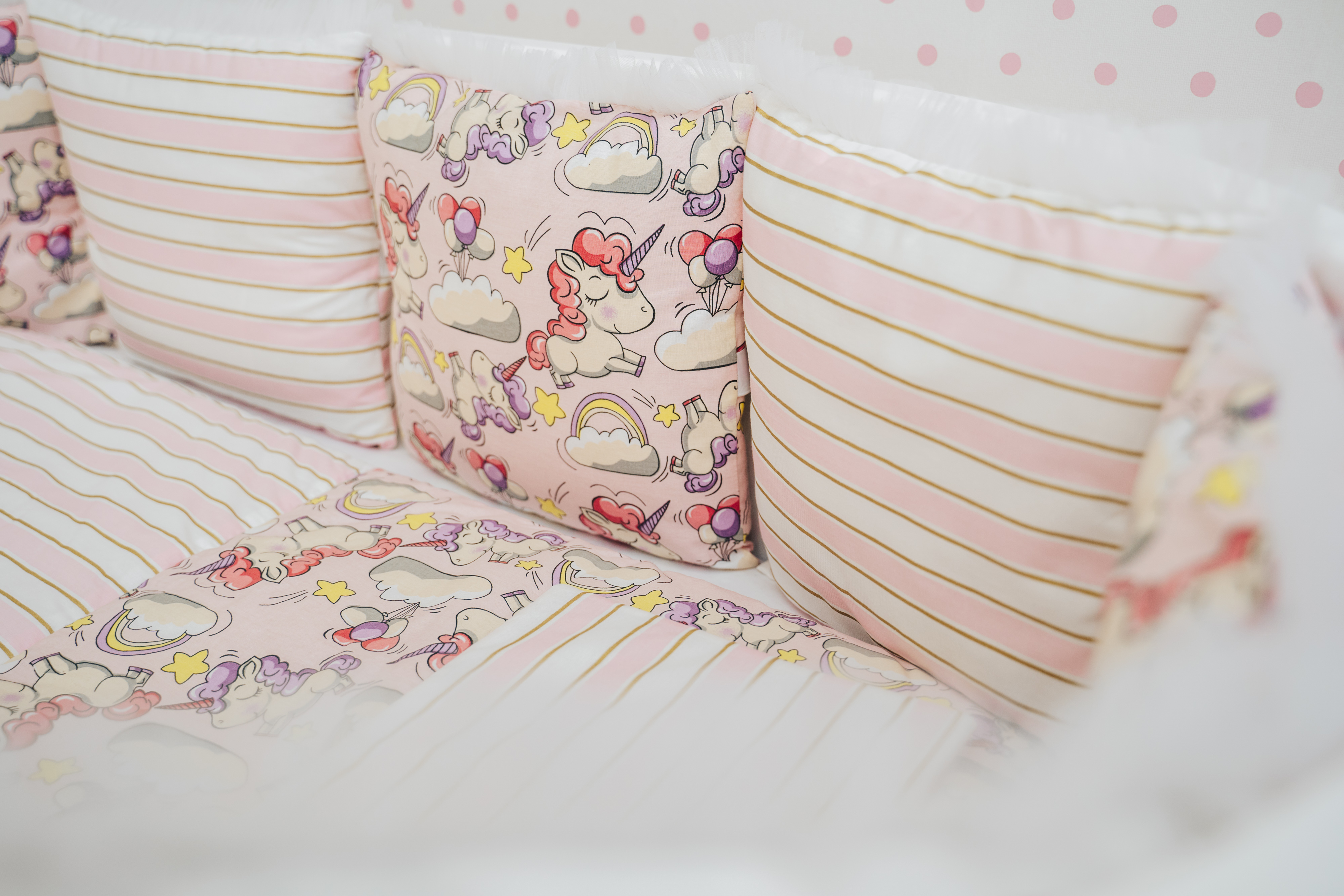 • 12 бортов-подушек со съёмными чехлами на молнии, размерами 32*30см.- универсальный борт на любую кроватку.
