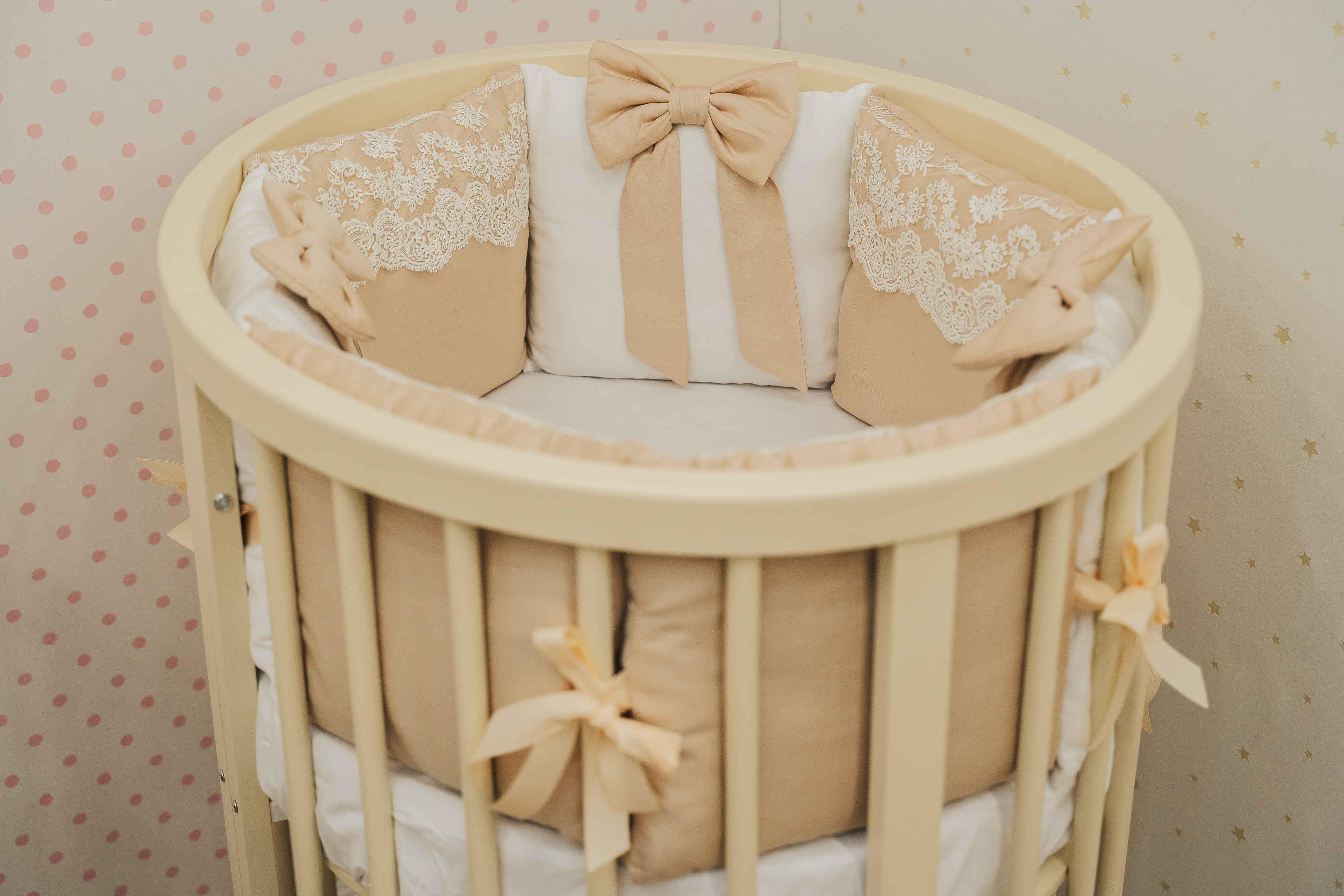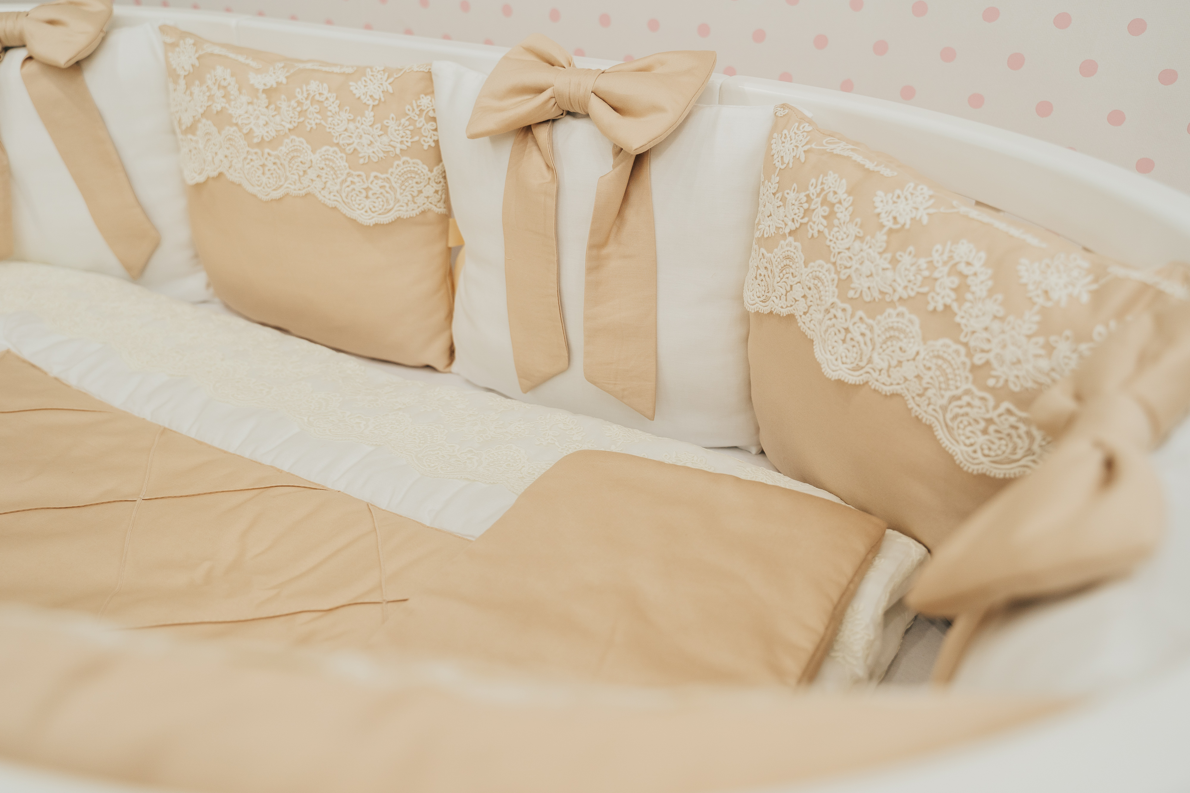 Настоящая роскошь с рождения – комплект «Крем-брюле» - шикарное кружево, качественная ткань класса люкс, нежные банты. Данный комплект бортов имеет съёмные чехлы на молнии, что очень практично в эксплуатации.