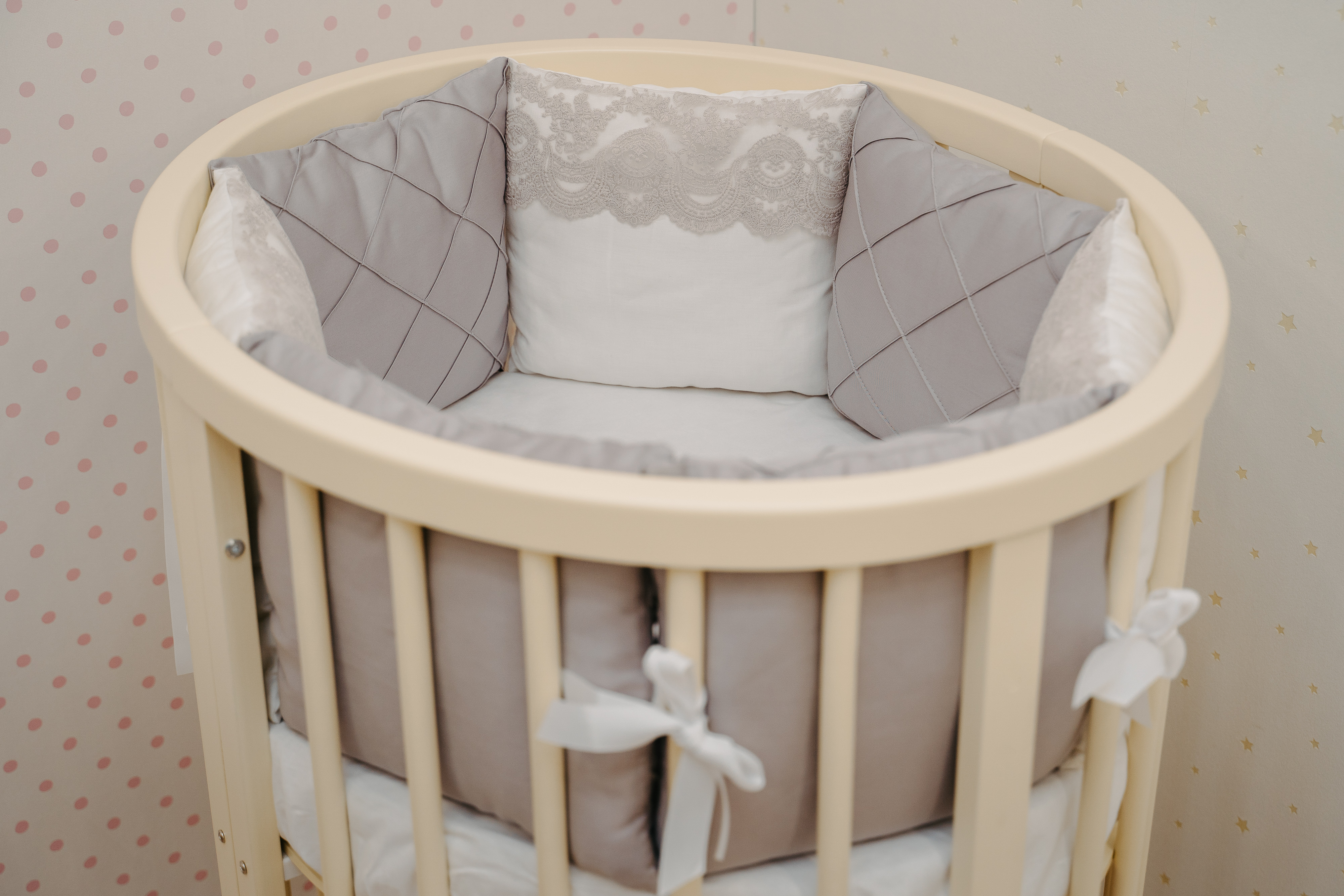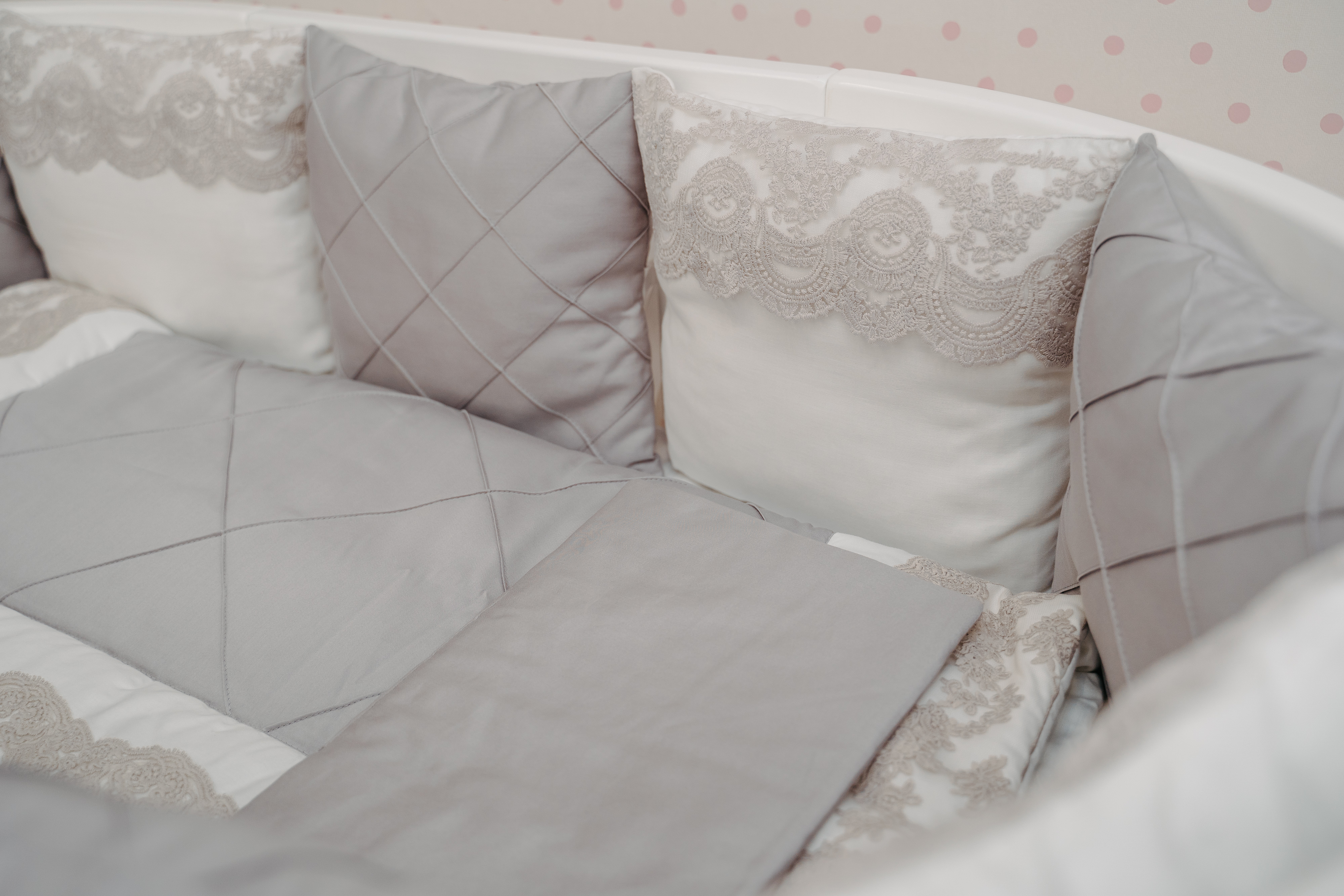 Настоящая роскошь с рождения – кружевной серый комплект из премиального мерсинизированного сатина. Прикоснитесь – и вы точно влюбитесь! Данный комплект бортов имеет съёмные чехлы на молнии, что очень практично в эксплуатации.